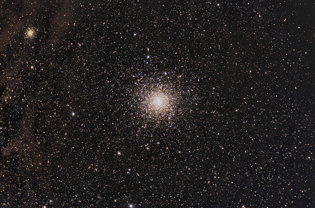 Messier Object 4 - ngc 6121 - globular cluster in Scorpius -- with ngc 6144 upper left Telescope : Explore Scientific ED80/f6 apo Triplet -- Camera : Canon XT-350d modified by Hap Griffin -- Mount : piggyback on Meade LX 200 Classic 12 for more information, go to the SEDS site at http://messier.seds.org/m/m004.html |
